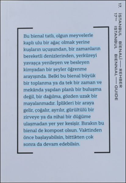 17 Eylül ile 20 Kasım 2022 tarihleri arasında düzenlenen 17. İstanbul Bienali'nde ziyaretçilere eşlik etmesi için hazırlanan bu rehber kitabı, İstanbul'un dört farklı bölgesindeki 12 mekâna yayılan bienal sergilerinde yer alan 50'yi aşkın projeyi tanıtıyor. Harita ve kat planları sayesinde sergileri kolayca dolaşabilmek, dolaşırken işlerle ilgili bilgi edinmek ve bienalin diğer programlarını incelemek için pratik yönlendirmeler sunan rehber, rahatlıkla taşınabilmesi için cep boyutlarında tasarlandı. Rehberin tasarımı Emre Çıkınoğlu'na ait.