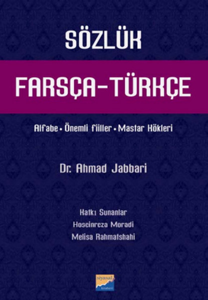 FARSÇA- TÜRKÇE Sözlük: Dr. Ahmad Jabbari yönetiminde; Hoseinreza Moradi ve Melisa Rahmatshahi'nin katkilariyla yayina hazirlanmis olup; yabanci bir dile sahip olmak için yeterli sayilan 2000-3000 araliginda Farsça-Türkçe kelimenin sözlük karsiliklariyla birlikte; alfabe, önemli fiiller ve mastar köklerinden olusan ayrintili üç bölüm daha bulunmaktadir.