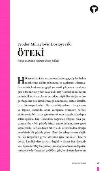 Memur Golyadkin, aniden çevresinde beliren ve her yönüyle kendisine tıpatıp benzeyen sureti yüzünden tüm itibarını yitirme tehlikesiyle karşı karşıya kalır. Dostoyevski'nin en tartışmalı kitaplarından olan Öteki, ürkütücü ve tekinsiz atmosferiyle okuru gerilim dolu bir yolculuğa çıkarıyor.